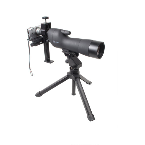 With the Firefield Spotting Scope Camera Adaptor, capturing the magic of the outdoors is as easy as taking a picture! The Firefield Spotting Scope Camera Adaptor mounts to most spotting scopes via an aluminum base, which can house a small point and shoot camera. Once the camera is attached, it aligns with the optical system of the spotting scope, so any outdoorsman can take pictures of what they see through the spotting scope.